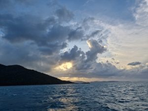 …hatte es dann etwas in sich… es war den Tag über 30Grad und sehr hohe Luftfeuchtigkeit…dann kam kurz nach Sonnenunterg ein Gewitter mit Regen vorbei, es blieb so warm wie zuvor, aber es fühlte sich an, als sei man im dicksten Dampfbad… durch den Regen konnten wir den Camper auch zunächst nicht lüften, da es dann reingeregnet hätte…. das ergibt ein anspruchsvolles Nachtklima…..